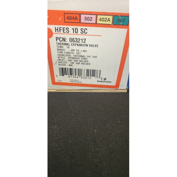 The Emerson HFES 10 SC is a high-capacity thermostatic expansion valve (TXV) designed to meter refrigerant flow and maintain proper evaporator superheat in medium/low temp applications. This valve is built for common refrigeration blends including R-404A, R-507, R-502, and R-402A, and features a straight-thru body, external equalizer, and a 5-foot sensing bulb cap tube for flexible installation.