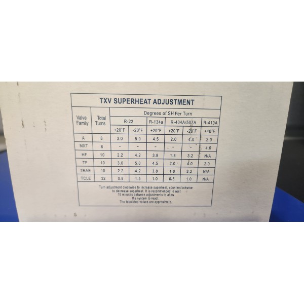 • R-404A / R-507A: ~1.8°F/turn @ +20°F, ~3.2°F/turn @ -20°F
